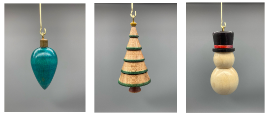 This is a beginner class and will use basic spindle turning skills to make a variety of ornaments such as holiday lights, snowmen, and trees. Buff up your spindle turning, bring your holiday spirit and join us for a little fun. Club tools for the event include the spindle roughing gouge, 3/8” spindle gouge or detail gouge, 1/8” parting tool, a point tool, and burn wires. A skew or flush cut pull saw will be helpful. Finishing supplies will be provided. Bring a snack for a late morning break.