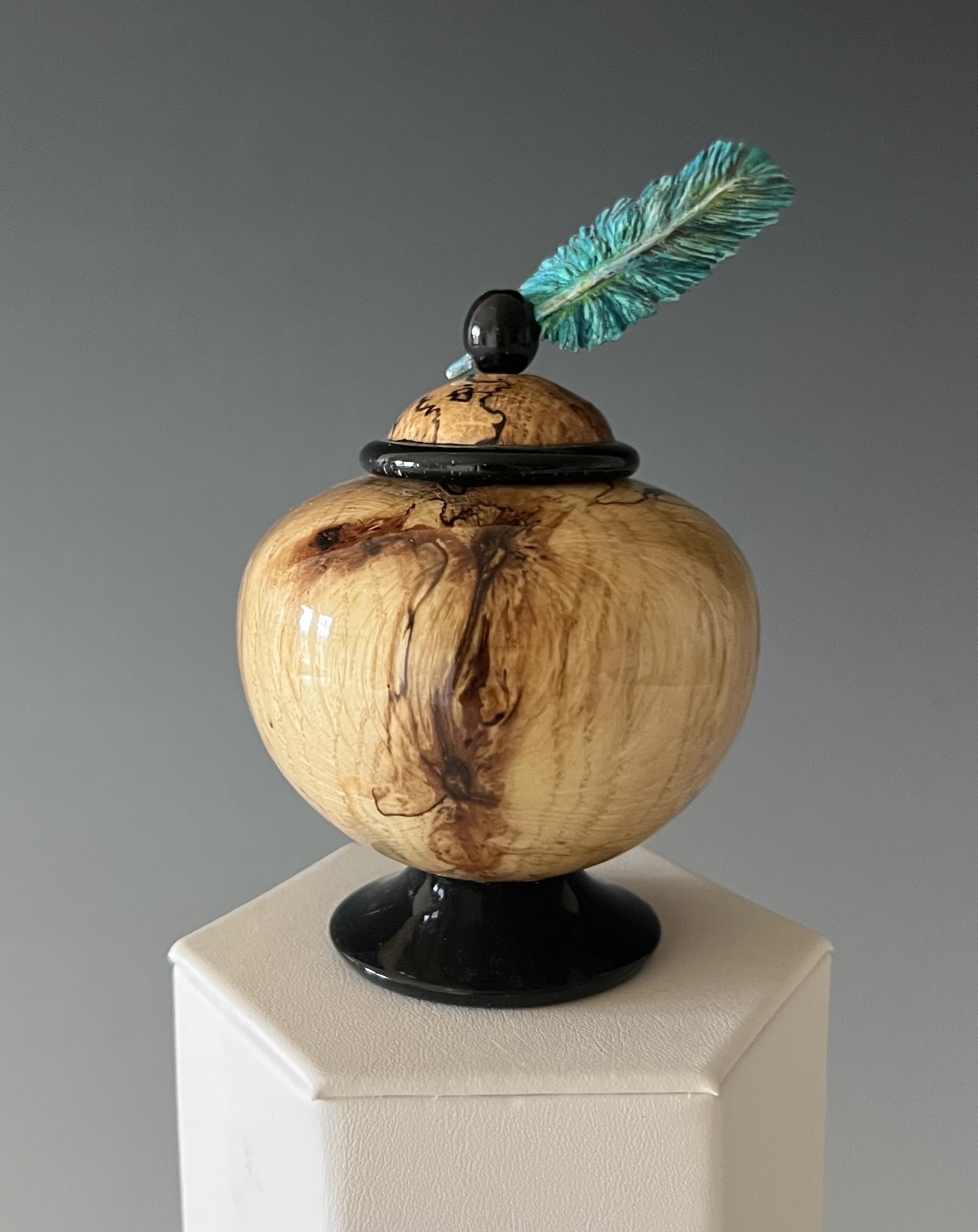 The feather was power-carved and painted with a transparent painting technique. It resembles the shape and color of the Kingfisher bird often found near rivers.